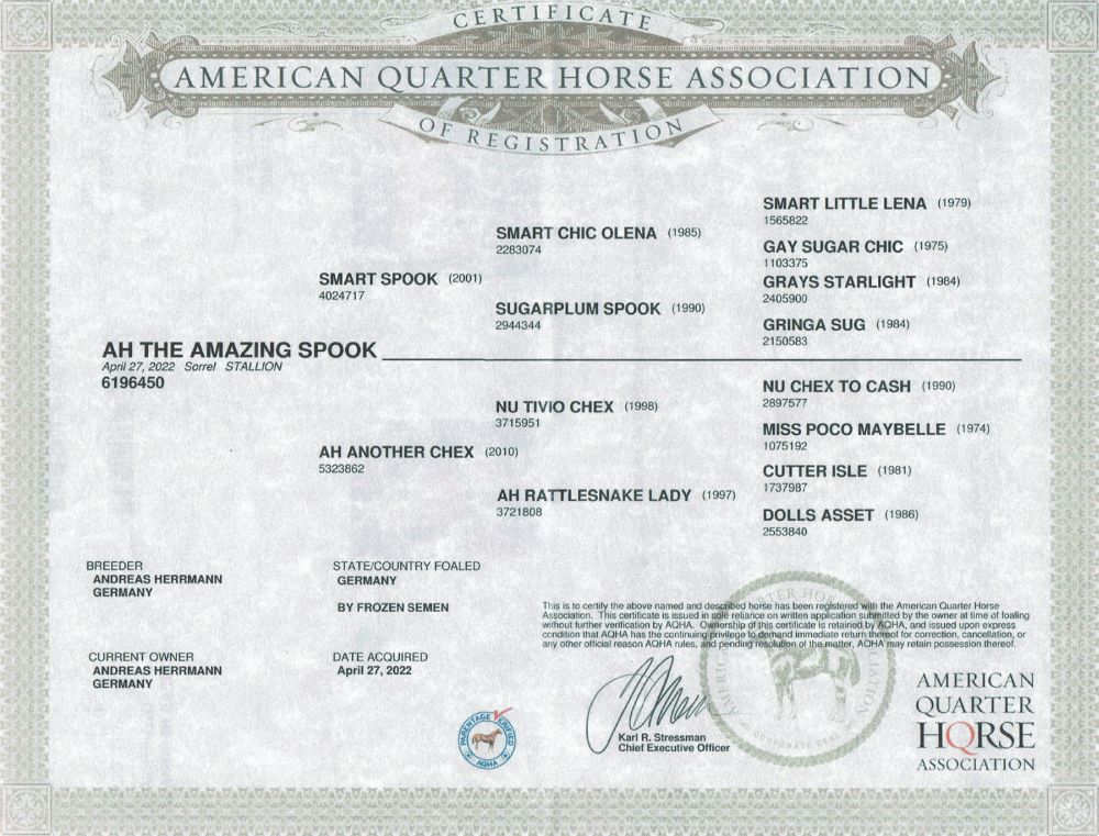 Väterlicherseits stammt er von SMART SPOOK, einem international bekannten Hengst aus der Reiningszene. Damit bringt er sehr gute Voraussetzungen für eine weitere Ausbildung im Reining, aber auch im Versatility Ranch Horse, Cowhorse oder Western Riding mit.